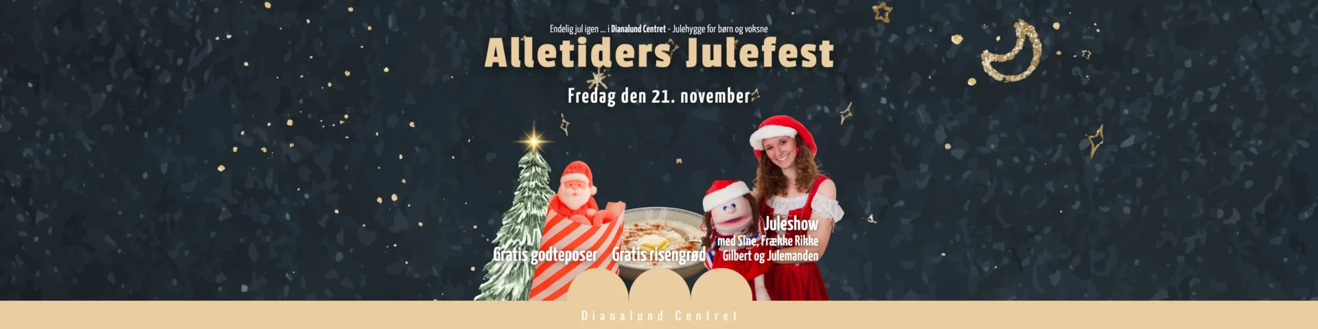 Kl. 16.30 – Juleshow med Sine, Frække Rikke, Gilbert og Julemanden – efterfulgt af juletræstænding og dans om juletræet